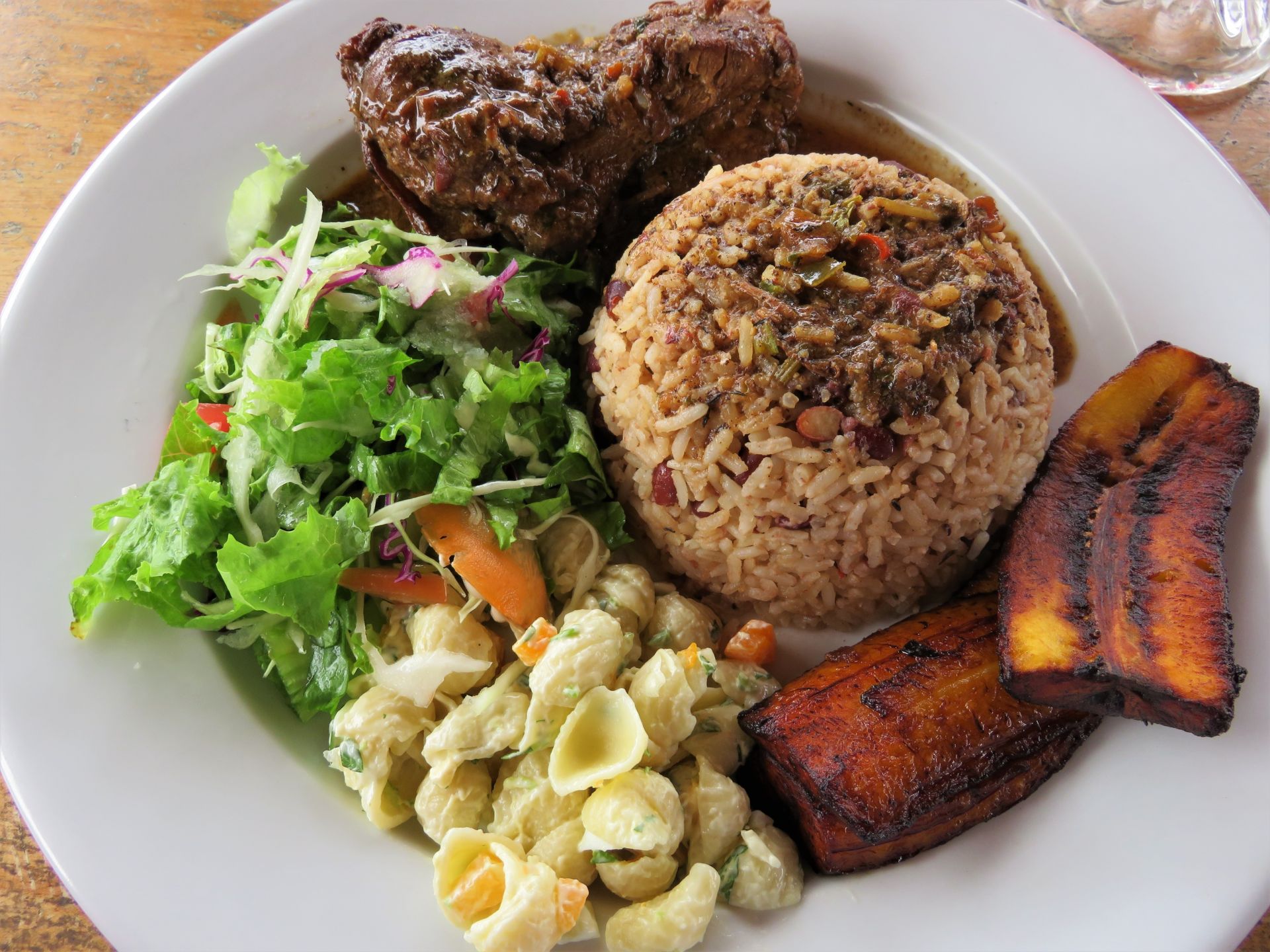 Served with your choice of rice, plantains, green salad, pikliz, and sauce.